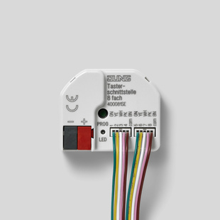 Die KNX Tasterschnittstelle von JUNG erlaubt die nahtlose Integration verschiedener Sensoren und Schalter in ein KNX System. Das ermöglicht eine effizientere und komfortablere Steuerung der Gebäudefunktionen. Taster, Tür-/Fenstersensoren, Hotelcard- oder Schlüsselschalter können über die potentialfreien Kontakte einfach in das KNX System eingebunden werden. Dies ermöglicht eine intelligente Steuerung von Beleuchtung, Heizung, Klimaanlage und anderen elektrischen Geräten. Ein weiterer großer Vorteil der Tasterschnittstelle ist ihre Vielseitigkeit. Sie unterstützt sowohl Leckage- und Betauungssensoren, als auch Temperatursensoren sowie Tür- und Fensterkontakte. Damit können Bauherrinnen und Bauherren die Sicherheit und Energieeffizienz ihres Gebäudes erhöhen. Die Tasterschnittstelle ist in 2-fach, 4-fach und 8-fach erhältlich.
